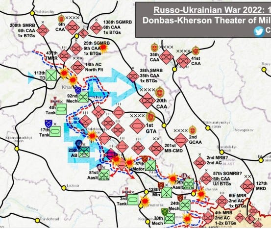 Further north and west, in Kharkiv region, regional defense head Oleh Sinehobov said UAF forces had recaptured Rohan’ which, if true, would reduce significantly RF ability to hinder supplies moving into the city, because Rohan’ is smack-dab on the M03 highway which points — please forgive the metaphor — like a dagger towards Chuguev and Izium. I’ve seen mixed reports on who owns Chuguev, but the weight of evidence seems to be that it belongs to 92nd Mech Brigade which, past weeks have shown, is one of better fighting outfits in the UAF.