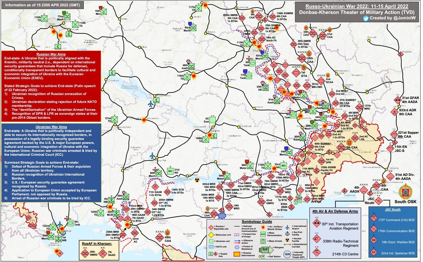 JominiAtWar published another of his excellent maps, covering the 11–15 Apri window, so I’ve attached it. As always it’s full of information and many of you don’t need me to explain it to you. What drew my attention, generally speaking, was the relatively thinness of the Ukrainian line, and the relative depth of RF units, particularly in the north-east Luhansk region. This is consistent with Ukraine Army General Staff (AGS) estimates that for weeks now have reported the RF is assembling a big force in the vicinity of Kupiansk and Izium, for an offensive towards Kramatorsk. It also fits a statement today by UAF intelligence, which thinks the RF has assembled as many as 22 battalion task groups (20,000–40,000 men) for the big offensive which will come.