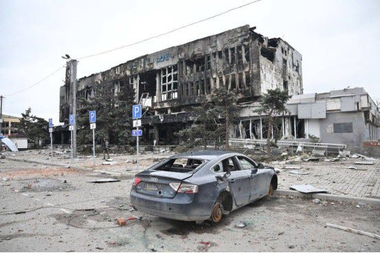 Two pix here for my Mariupol friends and acquaintances — first the train station that we used for years and years, and the way it is now. There are many buildings worse damaged, but the train station we all remember.