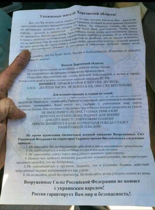 In Kherson, RF authorities are handing out flyers explaining that RF occupying forces are here to help and thank heavens because Ukraine was close to being taken over by the Americans and NATO. How does the RF believe this stuff, you ask? My answer is probably no one in the RF chain of command does, they are just passing on the fake pretext to others, just like they are accepting fake pretexts to do their jobs. Do not underestimate the ability of a large authoritarian organization to accept lies long term. Cognitive dissonance can go on for years, unless something painful happens to wrench the dissonant back to reality. Image of flyer attached.
